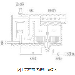 高密度沉淀池由混合区、絮凝区、斜管沉淀区、污泥浓缩区、中间集水渠及污泥回流系统和剩余污泥排放系统组成。基本构造见图1。